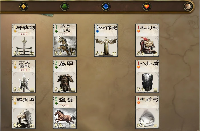 土属性装备配金属性武器,额外增伤,压制水属性武将。比如云锦袍的额外装备栏,干扰依赖手牌数量发动技能的武将节奏。可同时装备多件土系装备,但麒麟佩的卜卦效果可能引发资源波动,影响战术稳定性,这点要留意!