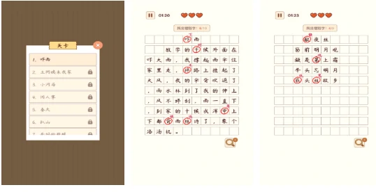核心玩法:找出语句错别字。关卡丰富,含短篇小作文、经典诗词、常用成语。支持单人挑战、在线PK其他汉字爱好者。操作简单,轻点屏幕标记错误,零上手难度。游戏中自然纠正日常用字偏差,加深汉字用法理解,越玩越觉汉字有意思。