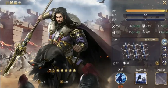 项羽:重骑兵功能型输出,技能御敌千里全场生效,提高己方10%伤害,降低敌人15点护甲,满级效果显著。改版适应前锋位置,全队受益,搭配高穿透兵种打出高效伤害,实用性突出。