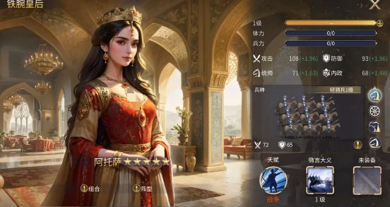 铁腕皇后:全能型英雄,攻击108、防御93。核心技能微言大义无冷却,降低所受弓兵伤害30%,正面突破战表现出色。