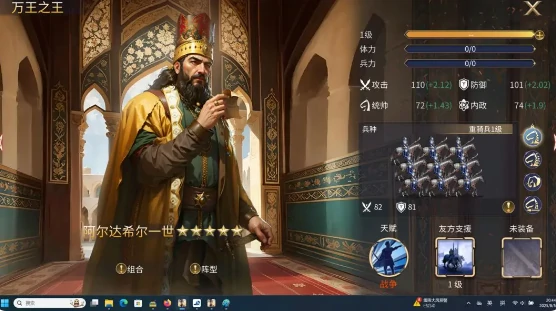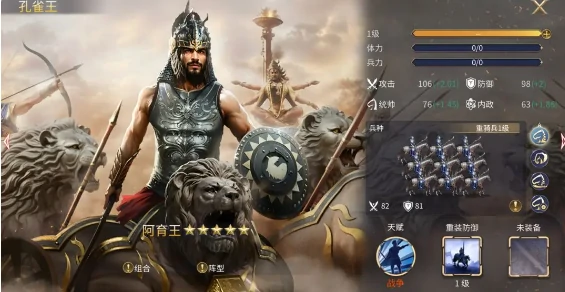 万王之王:重骑兵顶级英雄,初始攻击110、防御101。附近友军提供30%减伤,满级57%。城市招募易满红进化,正面冲锋、承担前排伤害不可替代,新手重点培养。