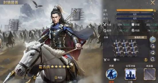 霍去病:辅助型核心,攻击防御均104。主动技能全军冲锋提升侧翼步兵80%速度,为所有骑兵提供35%减伤。主流阵容10-12秒远程免伤保护输出,与孙武配合无缝衔接前排,提高团队容错率。