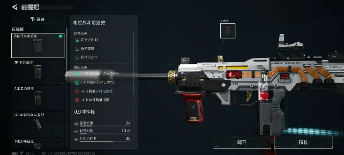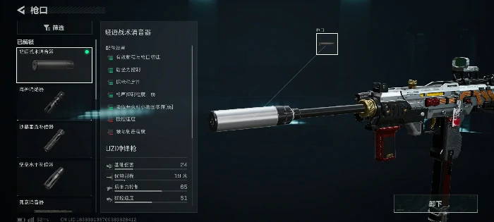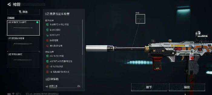 枪管选UZI竞赛型长枪管,和消音器搭配把优势射程拓展到19米,优化枪械稳定性。虽降低操控速度,但UZI基础操控68,影响有限。