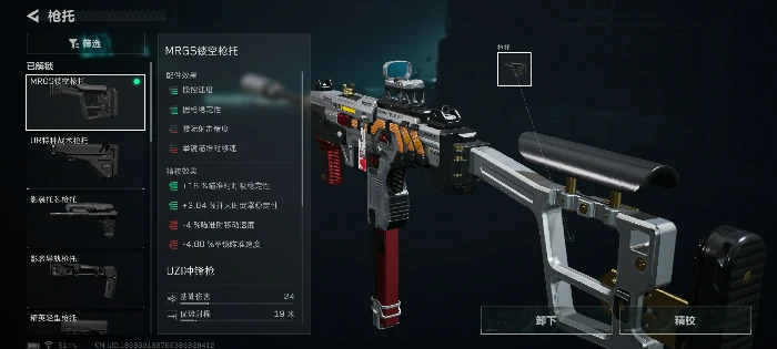 枪托选MRGS镂空枪托,降低开镜移速和腰射精度,提升操控速度和据枪稳定性,综合收益高。