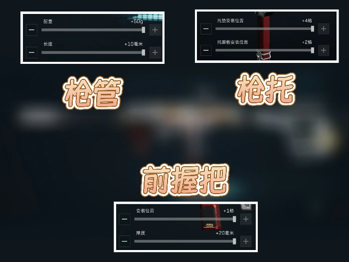 枪管、枪托和前握把精校参数全部向右拉满,提升稳定性和子弹初速,提高对枪胜率,基本不影响操控速度。