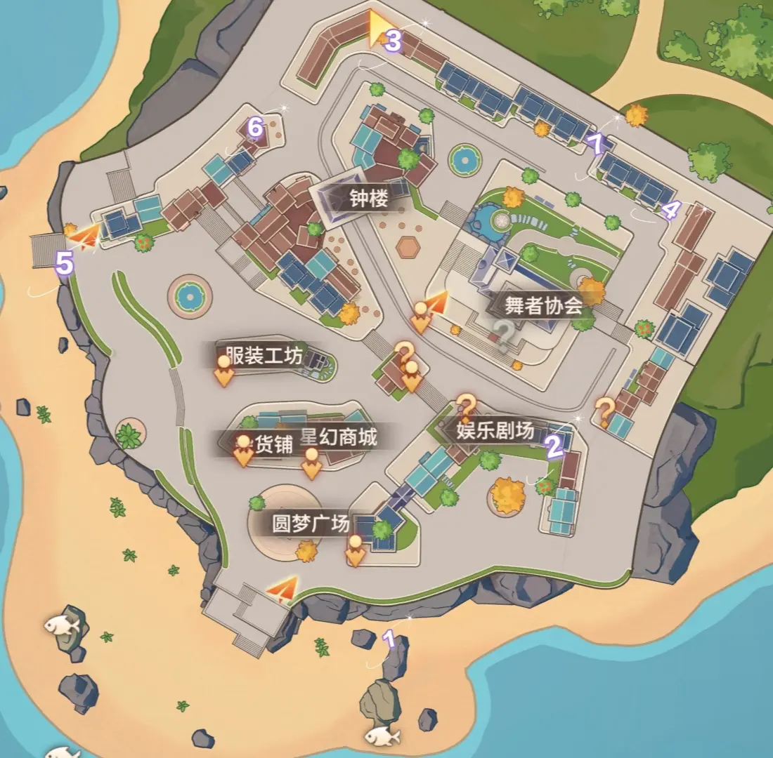 剩下的宝藏的位置给小伙伴们在图中也进行了标明,娱乐剧场这里就是第二个点位,圆梦广场下方,就是上述提到的流程,为第一个宝藏的位置,第三个点位则是在钟楼的正上方,第四个点位在舞蹈协会的右边的斜上方。