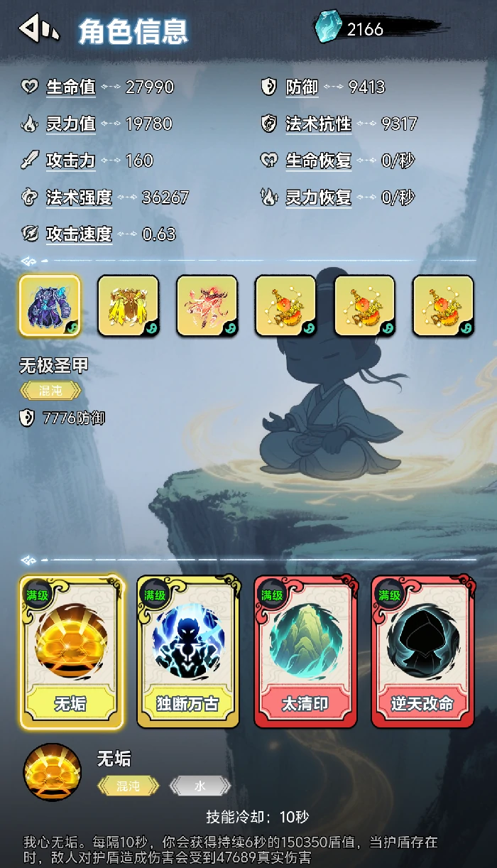 核心技能选无垢:法强生成护盾,触发真伤反击,10秒冷却,护盾持续6秒,前90关生存无忧,护盾厚度超生命值。
