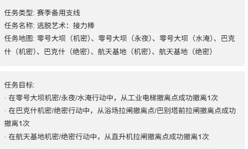 三角洲行动S7逃脱艺术接力棒任务:零号大坝、巴克什、航天基地拉闸撤离点各成功撤离1次。