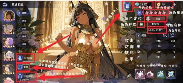 3、角色立绘左下角:热门方案—查看引用其他玩家配置;重置—未派遣、锁定、编队状态下返还养成资源,退回升阶消耗角色卡;转化技能—未派遣、锁定、编队、升阶时消耗角色转化为可装备技能。