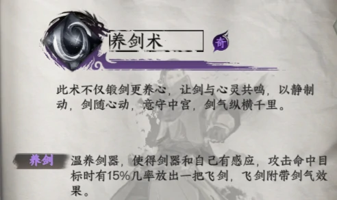 养剑术效果:温养剑器,提升剑感应能力;攻击命中目标时,15%概率释放飞剑,附加剑气伤害,为实用输出型绝技。