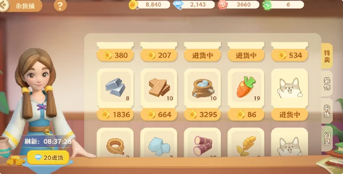 7.杂货店采购策略:清空特卖区订单相关且制作耗时材料(小麦甘蔗等即时种植的除外),买下杂货区鱼饵、玲珑和幻灵区头像,之后酌情购入建筑提升繁荣值。