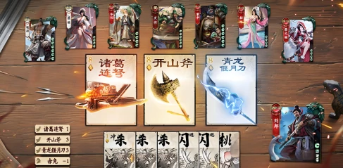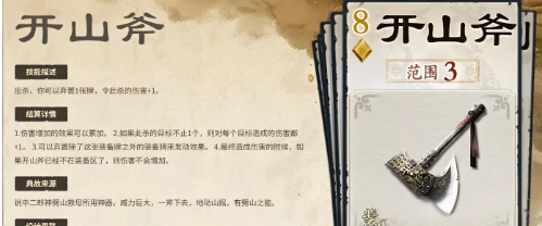 开山斧:攻击强化装备,提升攻击距离与暴击伤害。专属技能地裂:打出杀时弃置一张手牌,该次杀伤害+1,效果可叠加。适合强攻阵容,关键回合实现清场。