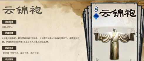 云锦袍:防御装备,被动提升装备栏上限2格。装备区满五件时,新装备自动替换最早装备牌。协同其他装备构建物理防御、火属性减伤与闪避加成多重防护,适配主将或持久作战阵容。