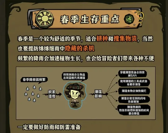 春季环境宜人,抓紧耕种,全力收集资源;注意连绵降雨,雨水加速植物生长,同时阻碍行动。