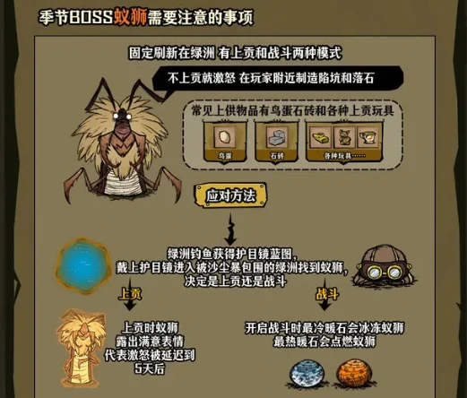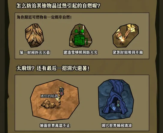 优先解决角色过热问题,做好物品防自燃措施,应对吃力就进洞穴避暑,关注蚁狮行为学应对策略。