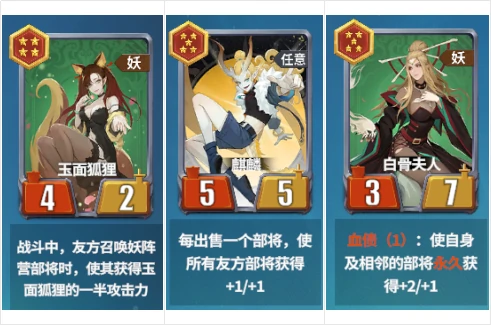 白骨夫人:万能卡,有狐狸优先养狐狸,无狐狸可自身成长,单位死亡触发效果,适配多阵容。