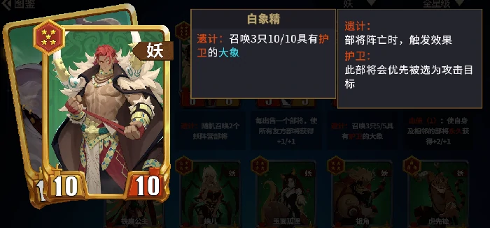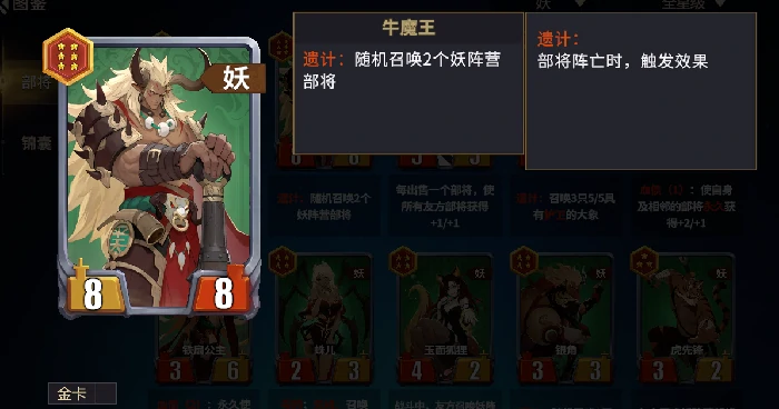 六星牛魔王:随机召唤两张妖族牌(不含自身17种,白板9种、毒药1种、不屈3种、守卫1种、带遗计召唤物4种),出白板概率高,六星性价比一般,金卡价值高。