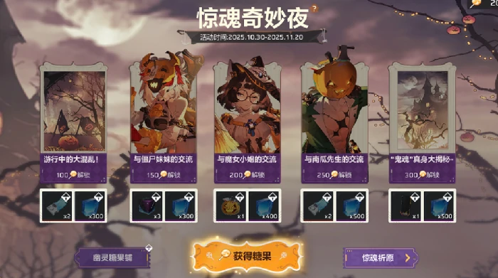 拿到南瓜波板糖,优先解锁惊魂之夜剧情章节!每完成1章,立即领记忆序列、勋章南瓜头、弦能晶石等奖励。全部剧情解锁后,自动开幽灵糖果铺,剩余道具可兑换基弦等角色培养资源,兑换比例以游戏内为准。