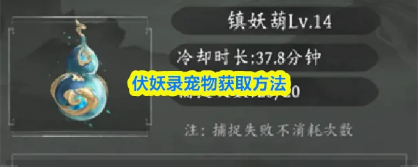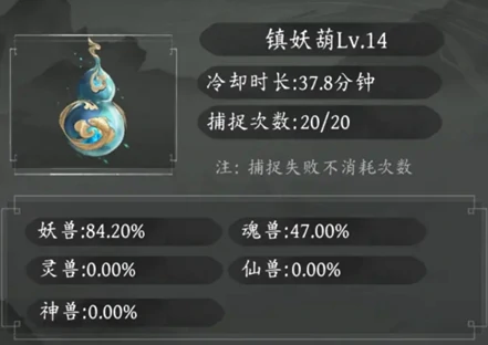 用镇妖葫在主线地图捕捉,道具有使用次数限制和冷却时间,次数可额外增加。初始次数20次,葫芦等级提升后,可捕捉宠物类型变化。葫芦14级捕捉魂兽,20级后有机会捕捉灵兽。