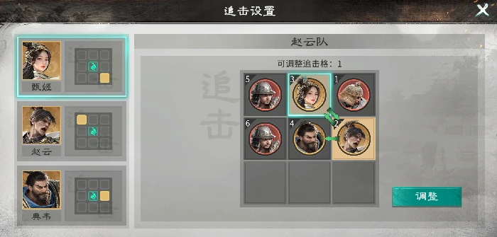 1. 布阵思路:后排双穿杨军补输出,藤甲兵置甄姬前承伤。赵云站甄姬、典韦追击格,额外触发追击;典韦天赋折冲左右护赵云,协同反击;甄姬天赋回赵云兵力、提闪避,赵云追击格调右上,让甄姬站入触发追击。