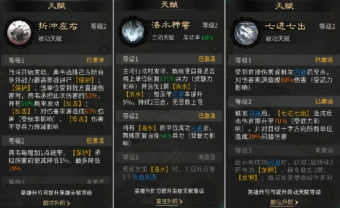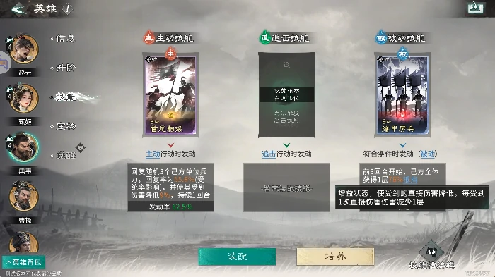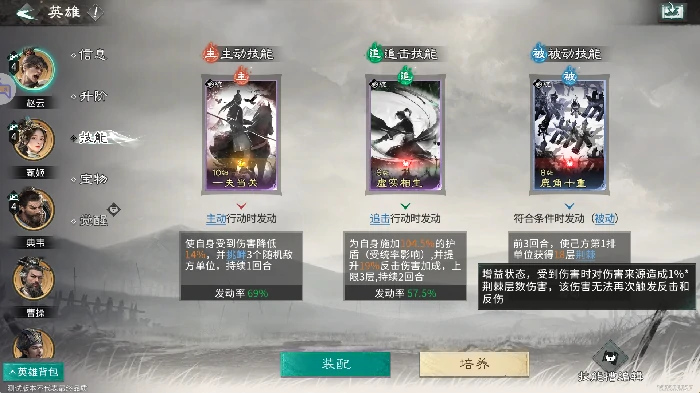 主动技能:带一夫当关,降自身伤害,随机挑衅三名敌方,逼敌优先攻赵云,增天赋七进七出发频率。