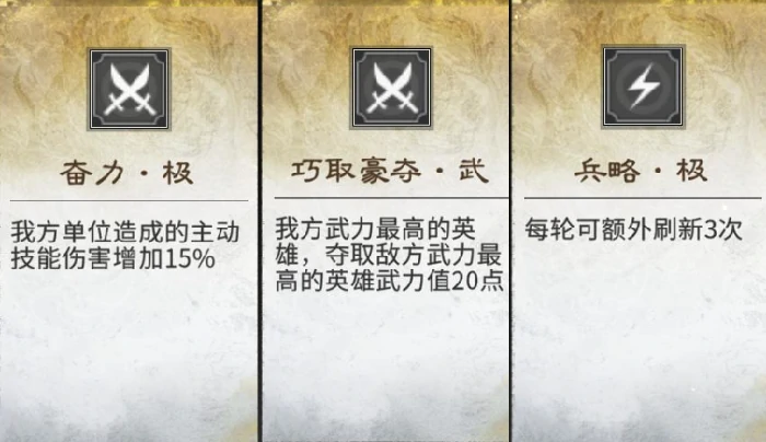 开局效果推荐:奋力·极(提15%主动技能伤害)、巧取豪夺·武(夺敌方高武力英雄20点武力)、兵略·极(每轮额外3次刷新机会)。