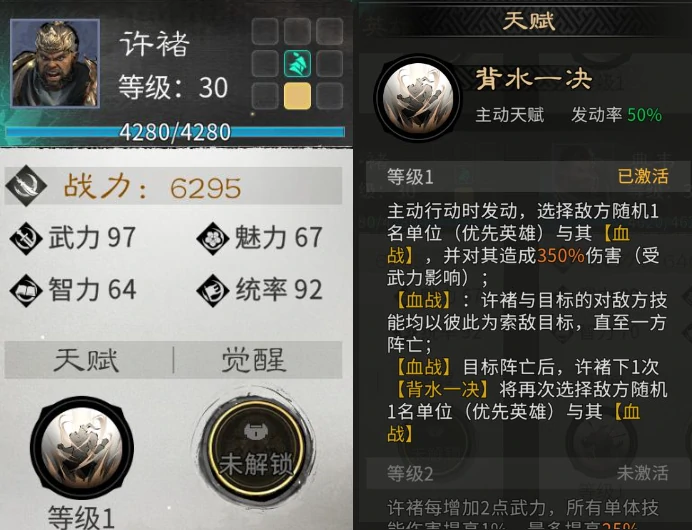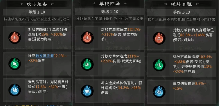 技能选择方向:武力输出类优先,如攻守兼备、单枪匹马、破阵直驱。典韦许褚组合,首选攻守兼备,次选单枪匹马。