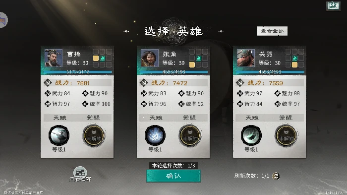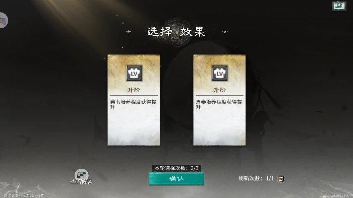 开局操作:系统提供效果、英雄、技能、士兵、宝物五类初始效果。首轮可刷新3次,英雄和士兵类别各选2项。