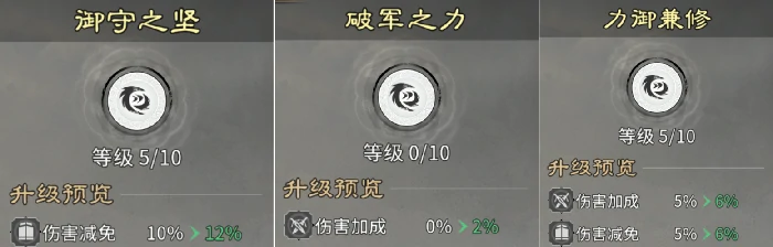 骑兵白马义从和术士太平道师强化力御兼修,每级同时提升1%伤害减免和1%伤害加成。