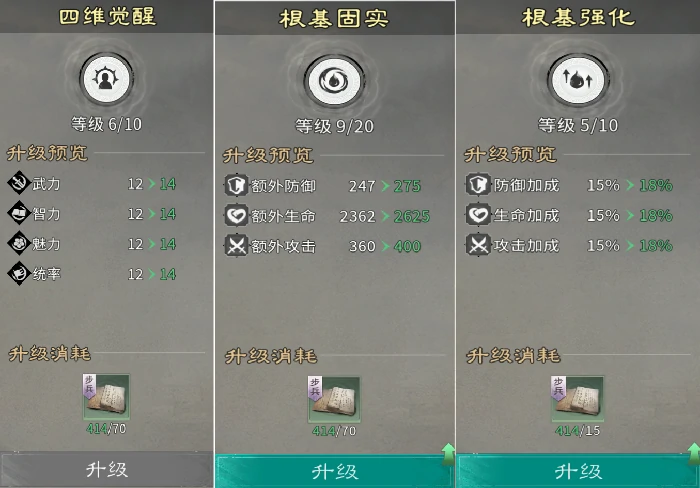 能力提升在技能培养有基础后进行,优先点出四维觉醒。四维属性提升全方位,加强输出、提高生存,战力增长最明显。