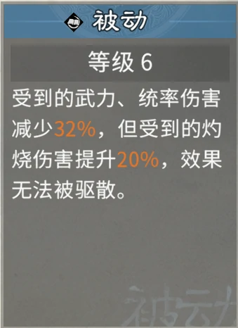 藤甲兵唯一具备减伤效果,被动技能令受到的武力和统率伤害降低32%,但受额外20%灼烧伤害。能在前排有效吸收伤害,保障英雄血量安全,创造良好输出环境。
