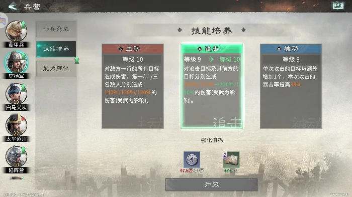 接着提升伤害增加或伤害减免,不同兵种有差异。盾兵藤甲兵强化御守之坚,每级提升2%伤害减免;弓兵穿杨军强化破军之力,每级提升2%伤害加成。