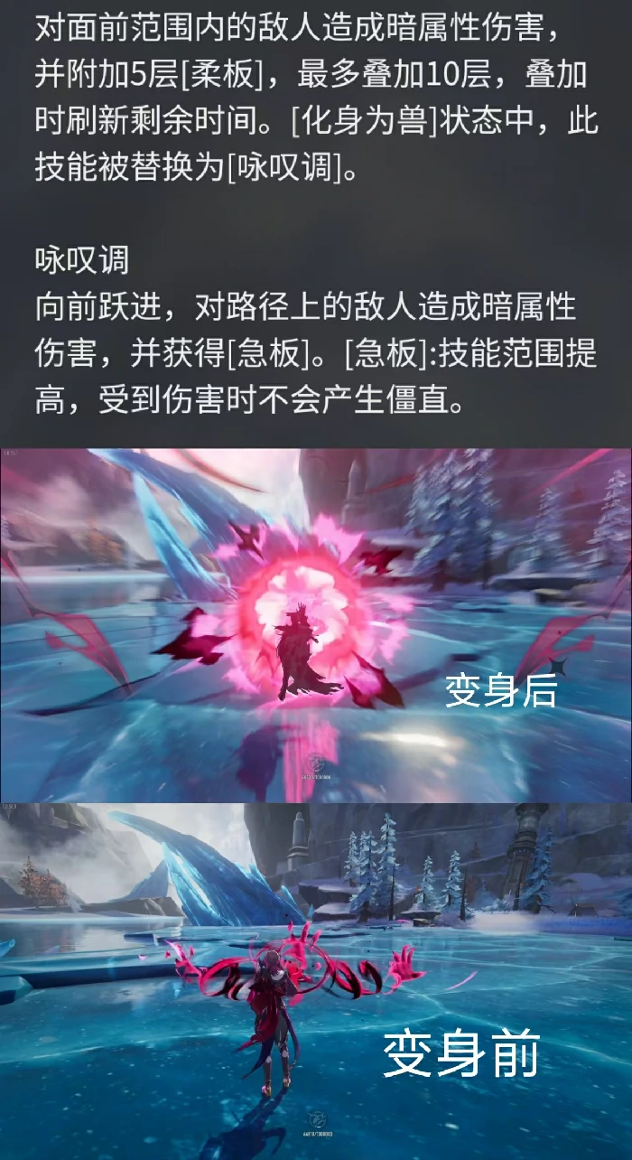变形后普通攻击转爪击,释放远程激光;小技能变螺旋跳,衔接下落攻击。