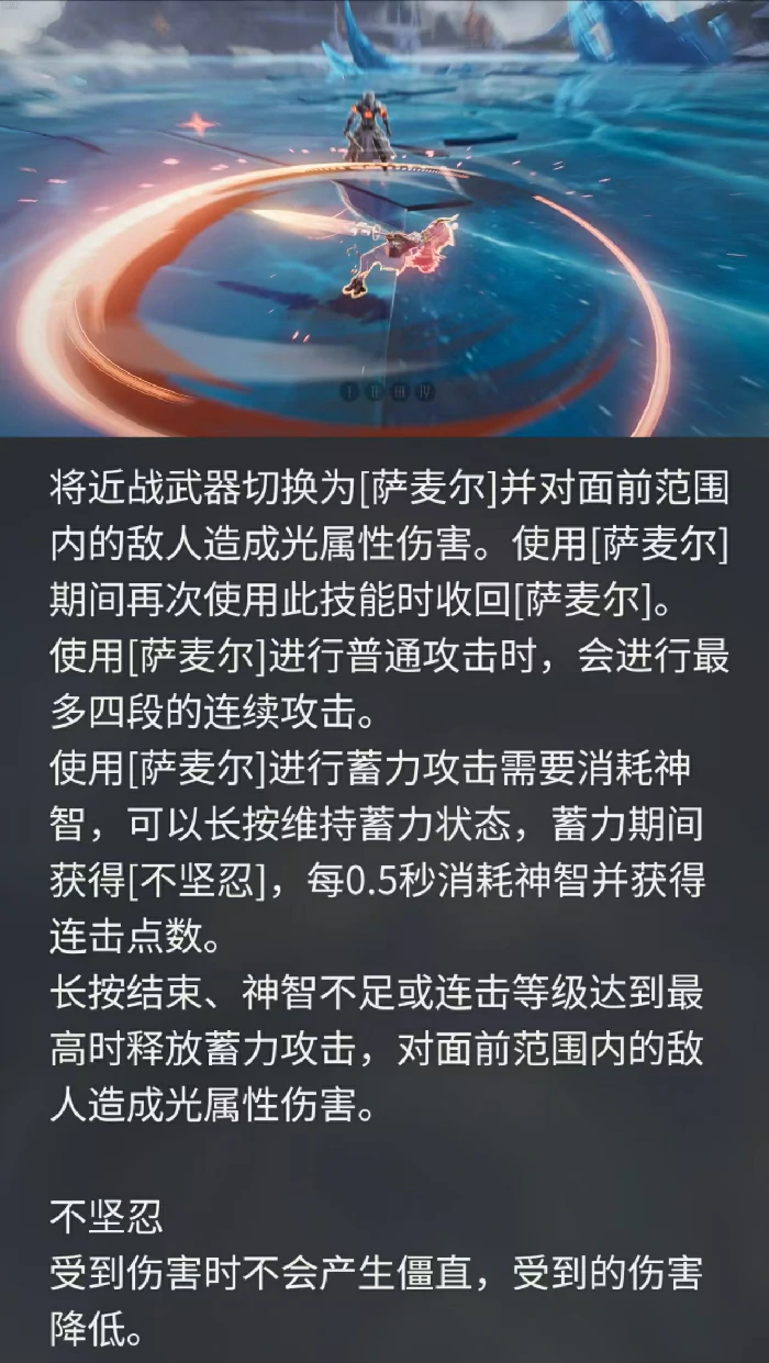 技能特点:位移挥砍范围小,难打满伤害;必杀技召唤巨剑,大范围旋转攻击。