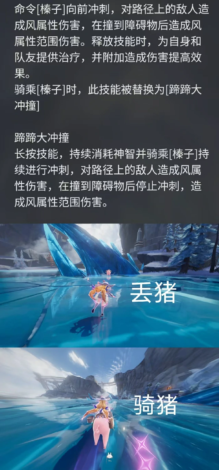 小技能操作:长按进入骑猪冲刺,大幅提速;短按投掷猪形道具,伤敌同时治疗队友,提供33%增伤。