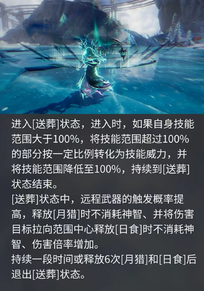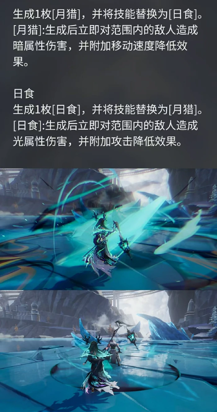 光属性小技能日食,攻击范围敌人,降低目标攻击力;暗属性技能月猎,对敌人施加减速效果。两种小技能释放后,均有概率自动重置冷却,实现连续释放。