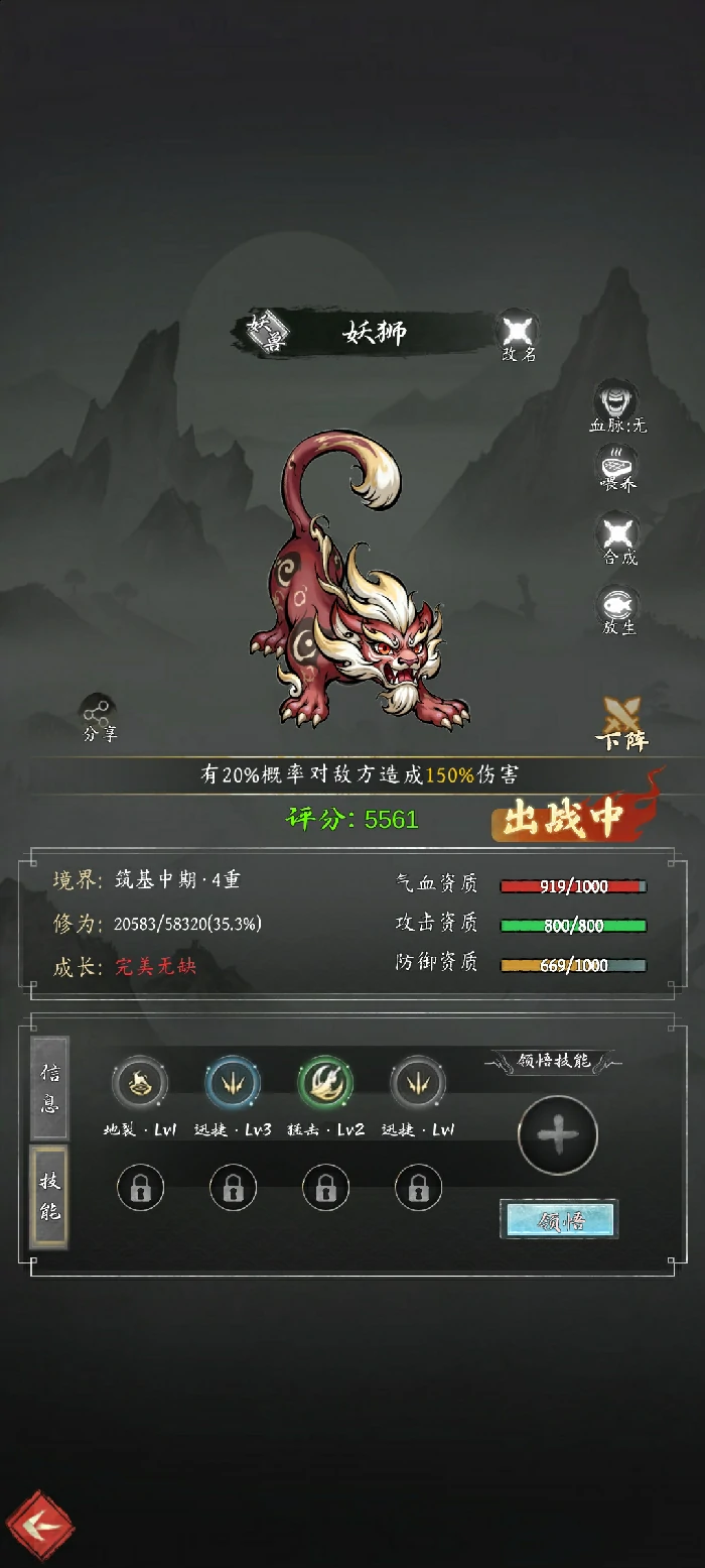 三、宠物合成保主宠,技能慢慢堆。主宠合成不掉,比如合狮子直接点。技能最高五级,前期别打书。带技能宠物全留,地裂技能必拿,2-3技能够用。合成公式记牢:0+1=1技,1+2=2技,2+3=3技,3+4=4技,4+3赌5技