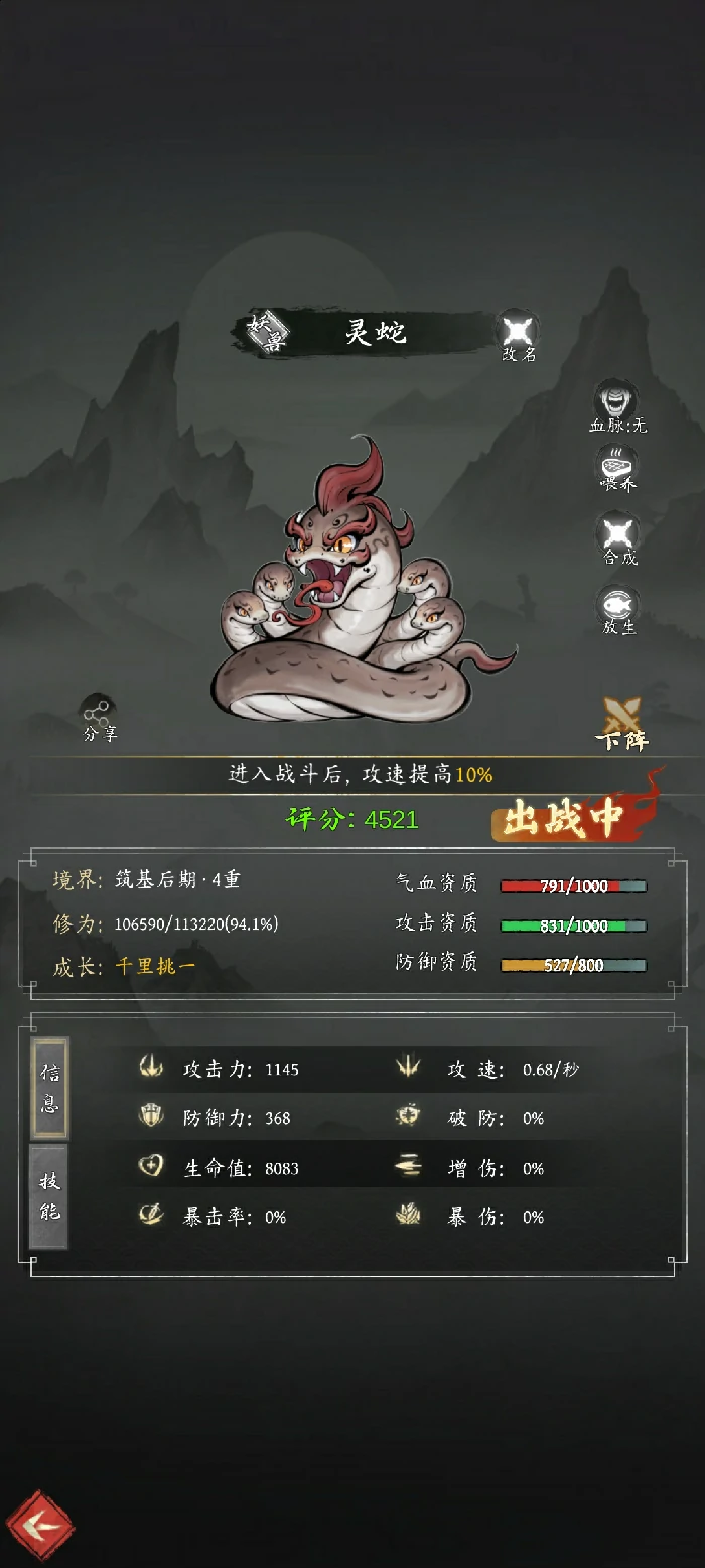 二、死磕主线任务,资源省着花。打完主线抓灵蛇,宠物品质按红色>橙色>蓝色>绿色挑,成长比资质重要。金丹前用橙色/红色灵蛇,攻速拉满提升战力