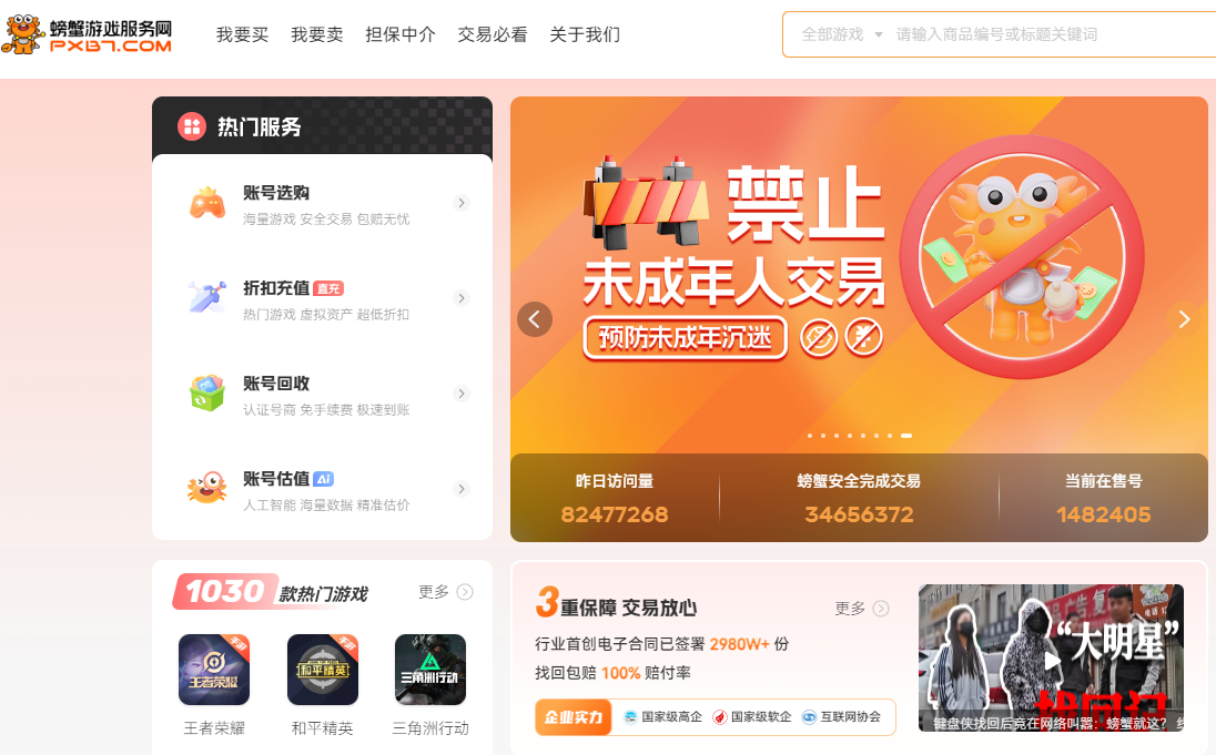 螃蟹游戏交易平台是游戏虚拟交易头部平台,累计注册用户超2000万,交易总量破1500万单。技术上首创电子合同交易模式,交易时间缩至1-2小时,并引入阿里云技术;安全方面构建电子合同、找回包赔(无时间限制)等多重保障体系,曾助用户法律维权胜诉;服务涵盖全品类游戏交易,专业客服24小时在线,还积极履行社会责任,反诈宣传视频播放量超10亿次。