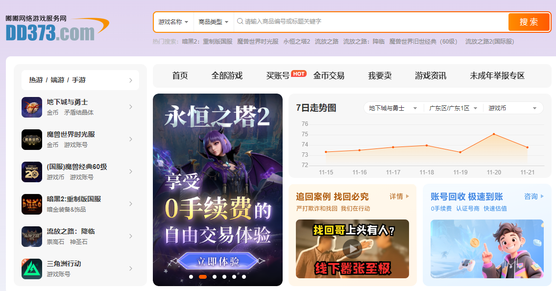 DD373是国内主流游戏交易电子商务平台,2012年成立,拥有超百万注册用户。特色包括多元交易模式,有寄售交易、担保交易、求购交易;安全机制完善,采用实名认证、加密技术、安全中心防骗验证及找回包赔服务;服务优势突出,7×24小时在线客服,支持多种支付方式且免交易手续费,通过抵用券和礼品让利用户,业务覆盖代练、手游、端游交易,2025年推出手机客户端,支持智能推荐、实时订单跟踪等。
