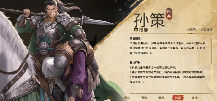 孙策能连续进攻,手牌数全场最高时发起对决,击败目标可再选角色对决,不用先出牌,连杀最多触发两次,优势时扩大战果。