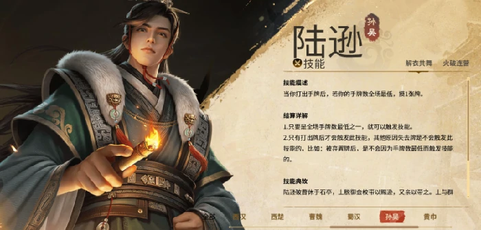 陆逊靠手牌管理,每打一张手牌,手牌数全场最低就多摸一张。满足条件还能弃牌干扰对手节奏。