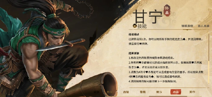 甘宁出场率高,出牌阶段把手牌花色转黑桃,洗牌后抽等量卡牌,当局结束花色复原。重点用红心杀打火焰伤害,靠属性攻击提输出。