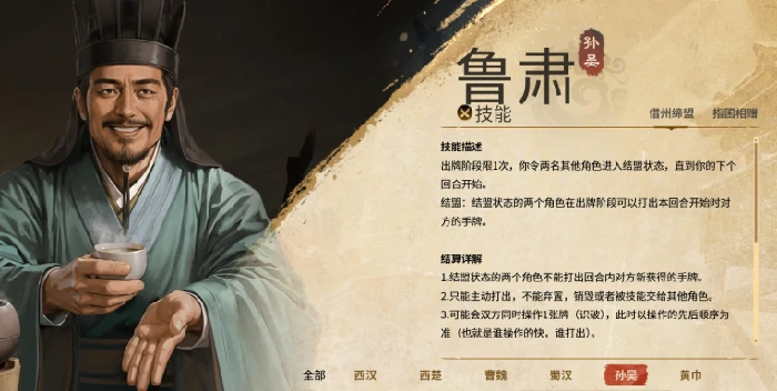 鲁肃强在协作,发动结盟绑两名角色到下一回合,结盟期间双方出牌阶段能用对方没弃的手牌,实现资源共享。注意新摸的牌不能用,出牌顺序得规划好。