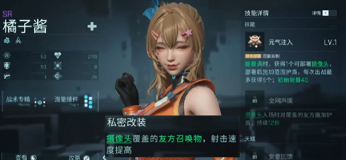 橘子酱提升召唤物攻速,能量积攒后部署摄像头提供范围护盾,每次出战最多初始获得5次能量(每次40点),对战术响应类角色效果显著。格拉苏等快速开大或高频召唤角色适合纳入召唤体系。