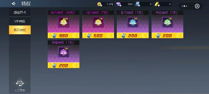 佣兵特权模块有佣兵特权、武力特权、冲级特权、穿戴特权四项。用点券直接解锁,点券主要来自购买月卡赠送。佣兵特权有联动性,激活后间接解锁其他特权,性价比最高。武力特权提升技能等级上限;冲级特权提高主线关卡经验获取效率;穿戴特权允许提前5级装备高阶装备,缓解过渡阶段压力。