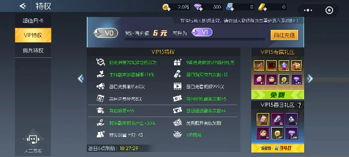 进入游戏,点击主界面左上角图标查看特权详情。当前特权分三大类:超值月卡、VIP特权、佣兵特权。超值月卡含特惠周卡、畅玩月卡、超级月卡。激活特惠周卡,每日领双倍挑战券和强化保护剂;选畅玩月卡,每天得200深渊券和黄金体力药;超级月卡解锁自动战斗功能,还提升史诗装备10%掉落概率。
