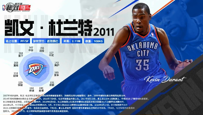 凯文·杜兰特:T0级得分手。掌握多样进攻手段,身体条件出色,攻防两端贡献巨大。中距离跳投、外线三分命中率高,单打、突破能力优秀,轻松撕开防守得分。凭借“死神投射”技能,成为胜负关键。