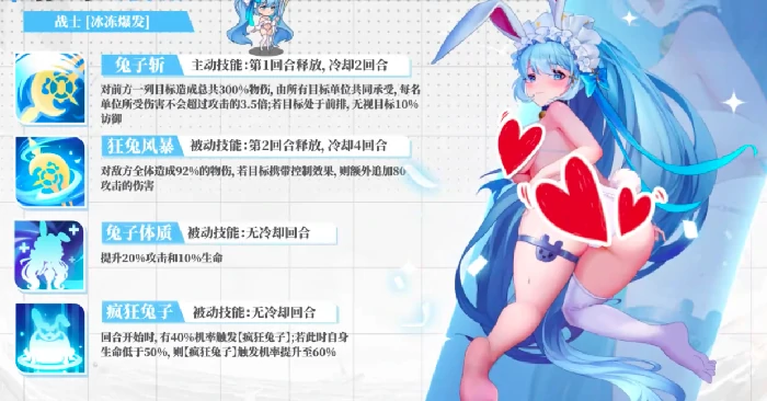主动技能兔子斩:首回合释放,冷却两回合。攻击前方多个目标,造成300%范围伤害(所有目标共同承担,单个不超过攻击力3.5倍),前排目标无视10%防御。