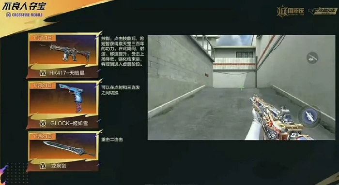 夺宝活动推出三款联动武器:HK417天暗星自动步枪,对标强化版朱雀,射速提升,移动速度优化;姬如雪手枪,格洛克原型,含角色主题元素,支持三连发,属英雄级;龙泉剑近战武器,攻速适中,综合均衡,适合近距离作战。